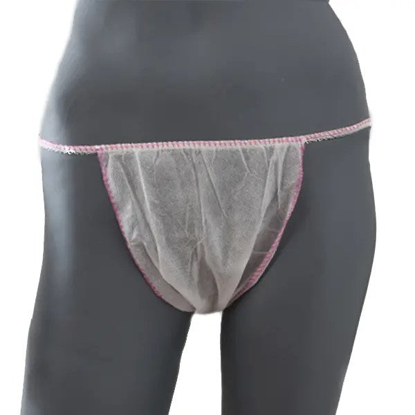 Tanga Mini Polipropileno Blanco con Ribete Rosa Bolsa 100 unds. Ref.250-TI